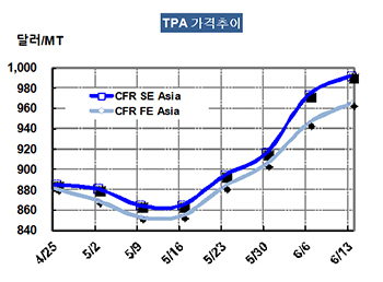 PTA 가격은 6월13일 CFR China 톤당 965달러로 20달러 상승했다.
