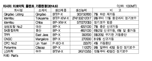 표,그래프: <아시아 아로마틱 플랜트 가동현황(2014.6)> <화학저널 2014/06/19> |