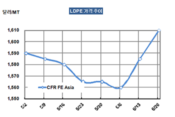 LDPE 가격은 6월18일 CFR FE Asia 톤당 1610달러로 25달러 급등했다.