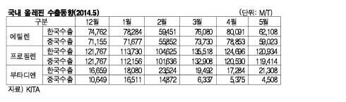 표,그래프: <국내 올레핀 수출동향(2014.5)> <화학저널 2014/06/23> |