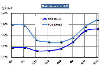 부타디엔 가격은 6월20일 FOB Korea 톤당 1371달러로 31달러 상승했다.