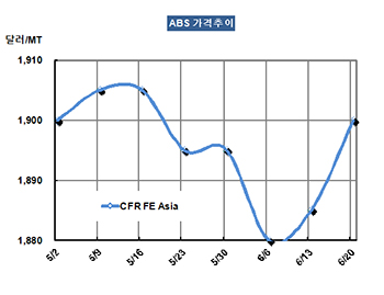 ABS 가격은 6월18일 CFR China 톤당 1900달러로 15달러 상승했다. ] 표,그래프: <ABS 가격추이> <화학저널 2014/06/25> |