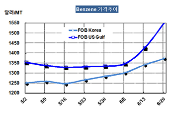 벤젠 가격은 6월20일 FOB Korea 톤당 1373달러로 32달러 상승했다.