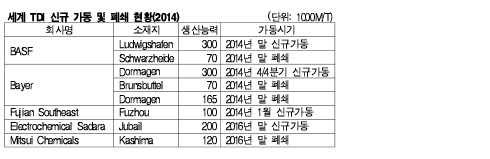 표,그래프: <세계 TDI 신규 가동 및 폐쇄 현황(2014)> <화학저널 2014/06/25> |