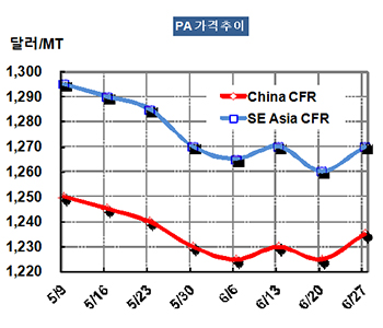 PA 가격은 6월26일 CFR China 톤당 1235달러로 10달러 상승했다.