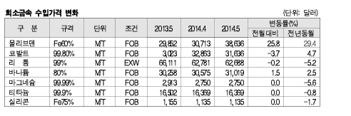 희소금속 수입가격은 2014년 5월 수요가 증가하면서 4.34% 수준 상승했다.