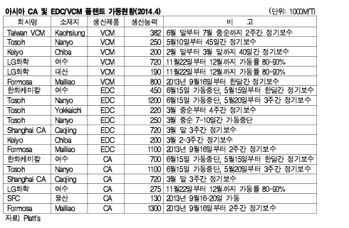Taiwan VCM은 Kaohsiung 소재 VCM 38만2000톤 플랜트를 6월 말부터 7월 중순까지 2주간 정기보수할 예정이며 Keiyo는 Chiba 소재 VCM 20만톤 플랜트를 2월 말부터 3월말까지 40일 동안 정기보수했다.