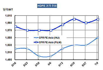 HDPE 가격은 7월2일 CFR FE Asia 톤당 1550달러로 20달러 상승했다.