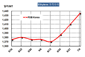 에틸렌 가격은 7월4일 FOB Korea 톤당 1435달러로 25달러 상승했다.