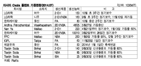 표,그래프: <아시아 Oxols 플랜트 가동현황(2014.07)> <화학저널 2014/07/08> |