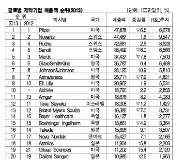 2013년 글로벌 제약기업 매출액 순위는 Pfizer가 매출액 478억달러로 1위를 차지하는 등 상위 10위권에는 변화가 없었고 매출액 100억달러를 돌파한 제약기업은 총 21사로 2012년에 비해 2곳 늘어난 것으로 나타났다.