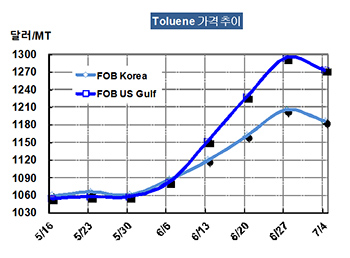 톨루엔 가격은 7월4일 FOB Korea 톤당 1186달러로 19달러 하락했다.