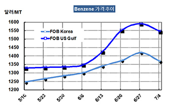 벤젠 가격은 7월4일 FOB Korea 톤당 1368달러로 52달러 급락했다.