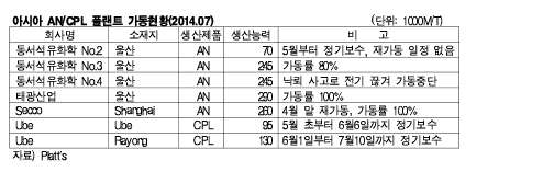 표,그래프: <아시아 AN/CPL 플랜트 가동현황(2014.07)> <화학저널 2014/07/10> |