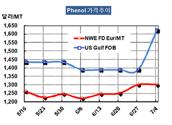 페놀(Phenol) 가격이 7월1일 FOB US Gulf 톤당 1609-1631달러로 231달러 폭등했다.