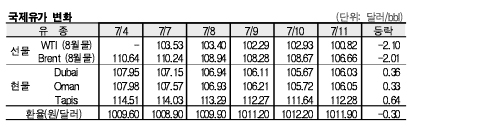 7월11일 국제유가는 중동‧북아프리카(MENA) 지역의 공급 차질 우려가 완화된 영향으로 하락했다.