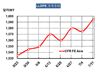 LLDPE 가격은 7월9일 CFR FE Asia 톤당 1595달러로 20달러 상승했다.
