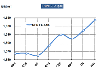 LDPE 가격은 7월9일 CFR FE Asia 톤당 1645달러로 25달러 급등했다.
