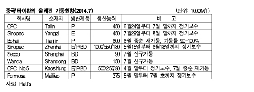 표,그래프: <중국/타이완의 올레핀 가동현황(2014.7)> <화학저널 2014/07/14> |