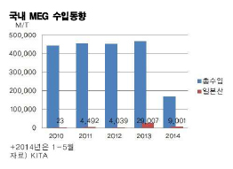 국내 MEG(Monoethyene Glycol) 시장은 일본산 수입이 증가하고 있다.