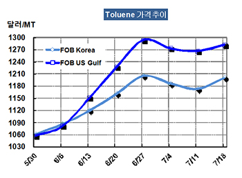 톨루엔 가격은 7월18일 FOB Korea 톤당 1200달러로 27달러 상승했다.