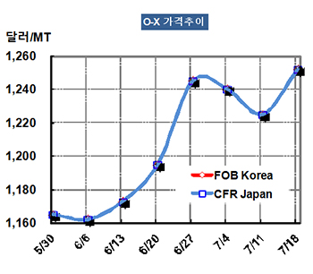 O-X 가격은 7월18일 FOB Korea 톤당 1252달러로 27달러 상승했다.