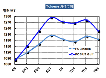 톨루엔 가격은 7월25일 FOB Korea 톤당 1185달러로 15달러 하락했다.