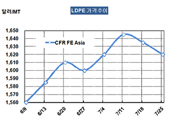 LDPE 가격은 7월23일 CFR FE Asia 톤당 1620달러로 15달러 하락했다.