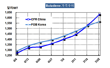 부타디엔 가격은 7월25일 FOB Korea 톤당 1565달러로 40달러 급등했다.