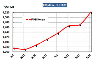 에틸렌 가격은 7월25일 FOB Korea 톤당 1520달러로 50달러 급등했다.