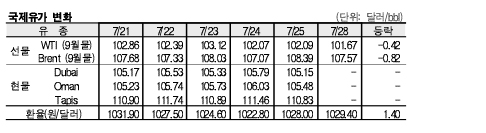 7월28일 국제유가는 글로벌 원유 수급 개선 및 지정학적 불안 완화 등의 영향으로 하락했다.