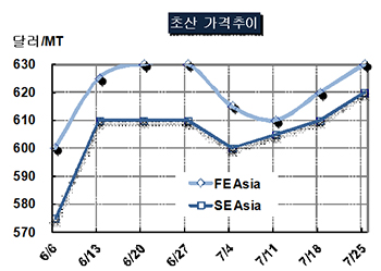 초산가격은 7월24일 CFR FE Asia 톤당 630달러로 10달러 상승했다.