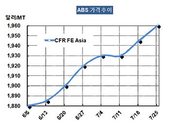 ABS 가격은 7월23일 CFR China 톤당 1960달러로 15달러 상승했다.