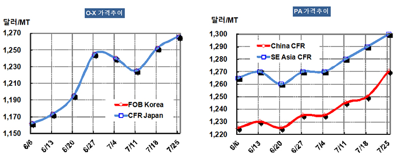 표,그래프: < O-X 가격추이 > < PA 가격추이 > <화학저널 2014/07/29> |