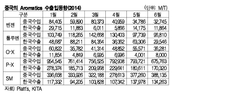 표,그래프: < 중국의 Aromatics 수출입동향(2014) > <화학저널 2014/07/29> |