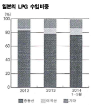일본이 미국산 LPG(액화석유가스) 최대 수입국으로 전환했다. 표,그래프: < 일본의 LPG 수입비중 > <화학저널 2014/08/04> |