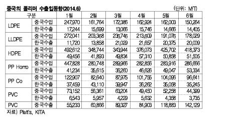 표,그래프: < 중국의 폴리머 수출입동향(2014.6) > <화학저널 2014/08/04> |