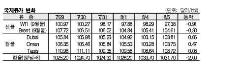 8월5일 국제유가는 글로벌 석유 수급 완화 지속 및 미국 달러화 강세 등의 영향으로 하락했다.
