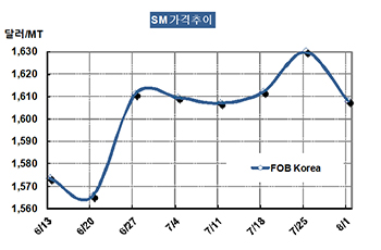 SM 가격은 8월1일 FOB Korea 톤당 1608달러로 22달러 하락했다.