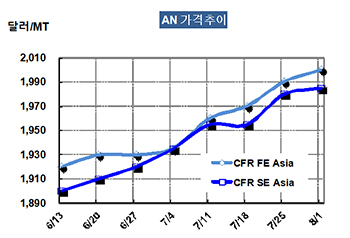 AN 가격은 7월29일 CFR FE Asia 톤당 2000달러로 10달러 올랐다.