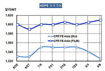 HDPE 가격은 8월6일 CFR FE Asia 톤당 1525달러로 15달러 하락했다.