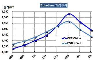 부타디엔 가격은 8월8일 FOB Korea 톤당 1435달러로 60달러 급락했다.