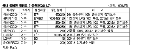 표,그래프: <국내 올레핀 플랜트 가동현황(2014.7)> <화학저널 2014/08/11> |