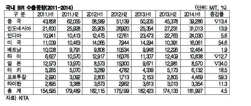 BR(Butadiene Rubber)은 2014년 상반기 중국 수출이 전분기대비 13.4%, 전년동기대비 21.4% 급감해 주목되고 있다.
