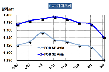 PET 가격은 8월6일 Bottle 그레이드 기준 FOB NE Asia 톤당 1282달러로 33달러 떨어졌다.