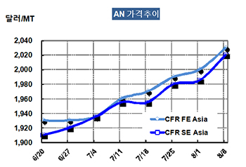 AN 가격은 8월5일 CFR FE Asia 톤당 2030달러로 30달러 올랐다.