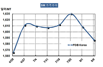 SM 가격은 8월8일 FOB Korea 톤당 1586달러로 22달러 하락했다.
