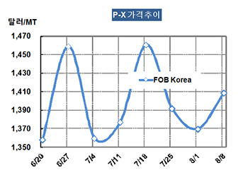 P-X 가격은 8월8일 FOB Korea 톤당 1409달러로 39달러 급등했다.
