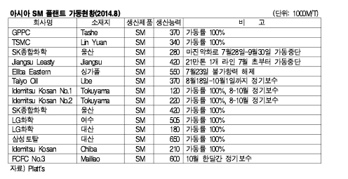 표,그래프: < SM 가격추이 >< 아시아 SM 플랜트 가동현황(2014.8) > <화학저널 2014/08/20> |