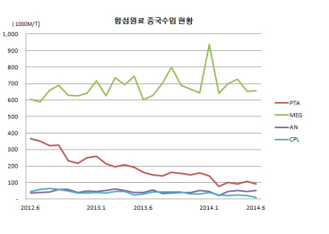 특히, PTA(Purified Terephthalic Acid)는 중국 수입량이 2012년 하반기 170만2104톤에서 2013년 상반기 122만6235톤, 2013년 하반기에는 91만299톤, 2014년 상반기에도 60만5499톤을 기록해 PTA 수입이 100만톤을 하회하고 있다. ![]() 2012년 6월 36만6848톤을 수입했던 것과 비교해 2014년 6월에는 9만792톤으로 4분의 1 수준으로 대폭 감소했다. 중국이 생산능력을 확대하면서 자급률을 끌어올린 영향으로 중국수출 의존도도 2012년 하반기 75.8%, 2013년 상반기 65.6%, 2013년 하반기 52.6%, 2014년 상반기 31.6%로 떨어졌다. 국내 PTA 생산기업들은 중국이 생산능력을 확대함에 따라 유럽 등 새로운 수출처를 확보하고는 있으나 중국이 2014년 말에만 940만톤을 신규 가동할 예정이고 다운스트림인 폴리에스터(Polyester) 섬유와 PET(Polyethylene Terephthalate)도 수요 약세가 지속되고 있어 중국산 PTA가 수출 시장을 잠식할 가능성도 커 국내 PTA 생산기업들의 신속한 대응이 요구된다. CPL(Caprolactam)도 자급률 상승으로 수입이 급격히 줄어들면서 카프로의 생존을 위협하고 있다. 중국은 CPL 수입량이 2012년 상반기 30만3528톤, 2013년 상반기 22만1438톤, 2013년 하반기 23만1452톤으로 소폭 감소했으며, 2014년 상반기에는 13만7765톤으로 20만톤에도 미치지 못했다. 우리나라는 2012년 상반기까지 2만1648톤을 중국으로 수출했으나 2012년 하반기 8000톤으로 급감한 이후 수출이 전혀 없는 상황이다. 반면, AN(Acrylonitrile)과 MEG(Monoethylene Glycol)는 수입이 비교적 일정한 수준으로 유지되고 있다. 중국은 MEG 수입이 2012년 하반기 383만2837톤, 2013년 상반기 411만8297톤, 2013년 하반기 412만7961톤, 2014년 상반기 431만3105톤으로 지속적으로 증가하고 있는 것으로 나타났으며, 우리나라는 MEG의 중국 수출 의존도가 100%에 육박하고 있다. AN 수입은 2012년 하반기 28만9254톤, 2013년 상반기 28만8772톤, 2013년 하반기 25만8810톤, 2014년 상반기에는 26만6549톤으로 25-29만톤 수준을 형성하고 있다. 우리나라는 2012년 상반기 이후 중국으로 수출이 지속적으로 증가해 2013년 하반기에는 12만9532톤을 기록했으나 2014년에는 9만2440톤으로 소폭 감소한 것으로 나타났다. <배정은 기자> 표,그래프: < 합섬원료 중국수입 현황> <화학저널 2014/08/20> |